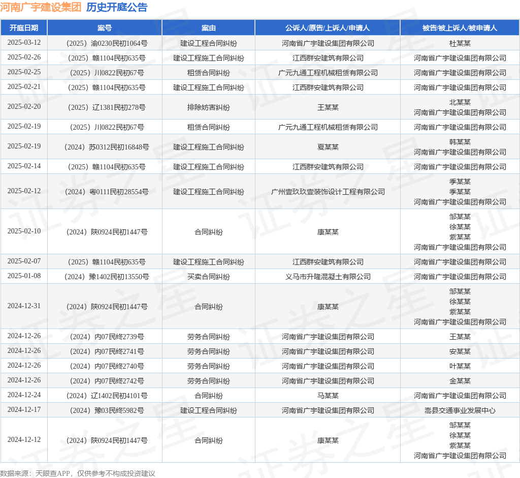 本站消息,根据天眼查APP显示,近日公布了一则河南省广宇建设集团有限公司作为被告/被上诉人的开庭公告,详细内容如下: